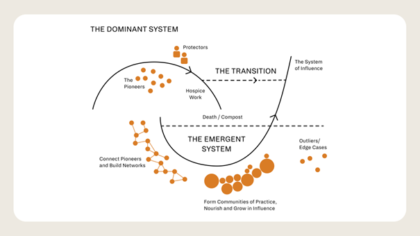 Graes werkt vanuit het duurzame transformatiemodel van het Berkana instituut over regeneratief leiderschap. Dit model benadrukt de dynamiek van leren en evolueren in complexe systemen in de overgang van pionieren in een dominant systeem naar de transformatie in een nieuw, opkomend systeem.
